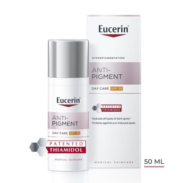 Eucerin Anti-Pigment Dnevna krema SPF 30 sadrži Thiamidol efikasan, patentiran sastojak koji deluje na ključni uzrok hiperpigmentacija tako što smanjuje proizvodnju melanina. Za njega je klinički i dermatološki dokazano da smanjuje tamne fleke i sprečava njihov ponovni nastanak. Prvi rezultati su vidljivi nakon dve nedelje i kontinuirano se poboljšavaju redovnom upotrebom.