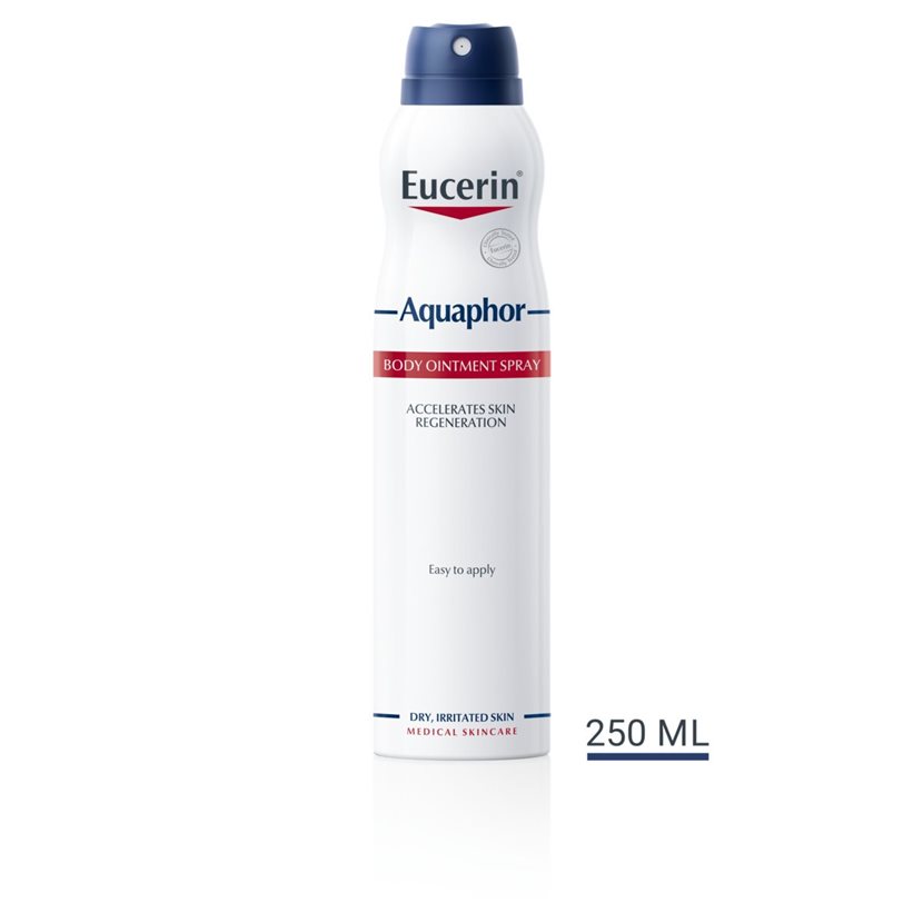 Kako se nalazi u inovativnoj boci za sprej, Eucerin Aquaphor Spej najbolje je koristiti za negu većih oblasti tela kao što su ruke, noge, leđa ili grudni koš. Pošto može da se prska i kad je postavljena naopačke, takođe je pogodna i za negu veoma suve kože na delovima tela koje je teško dohvatiti kada koristimo običnu mast. Izbegavajte da prskate sprej direktno na ili u blizini lica. Ako imate veoma suvu ili grubu kožu na manjim oblastima tela, probajte Eucerin Aquaphor Regenerativnu mast.