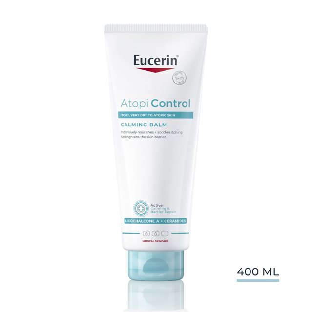 Eucerin AtopiControl Balsam je balsam za telo za svakodnevnu upotrebu koji je posebno formulisan da umiri i intenzivno hidrira iziritiranu kožu koja svrbi. Lagana ali hranljiva formulacija na bazi ulja u vodi obogaćena je umirujućim likokalkonom A, ceramidima i shea buterom kako bi se ojačala barijerna funkcija kože i ublažili suvoća i svrab. Tokom upalne faze, koristi se zajedno sa Eucerin AtopiControl Kremom za akutnu negu, Eucerin Sprejem protiv svraba i uobičajenom terapijom koju je propisao lekar.