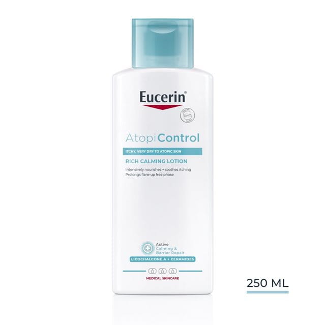 Eucerin AtopiControl losion je losion za telo koji se koristi svakodnevno i posebno je formulisan da umiruje i intenzivno hidrira iritiranu i kožu koja svrbi. Losion, koji se lako upija i ima voda-u-ulju formulu, obogaćen je umirujućim Likokalkonom A, ceramidima i omega uljima, koja jačaju zaštitnu barijeru kože, ublažavaju suvoću i svrab, te produžavaju periode između pogoršanja atopijskog dermatitisa.