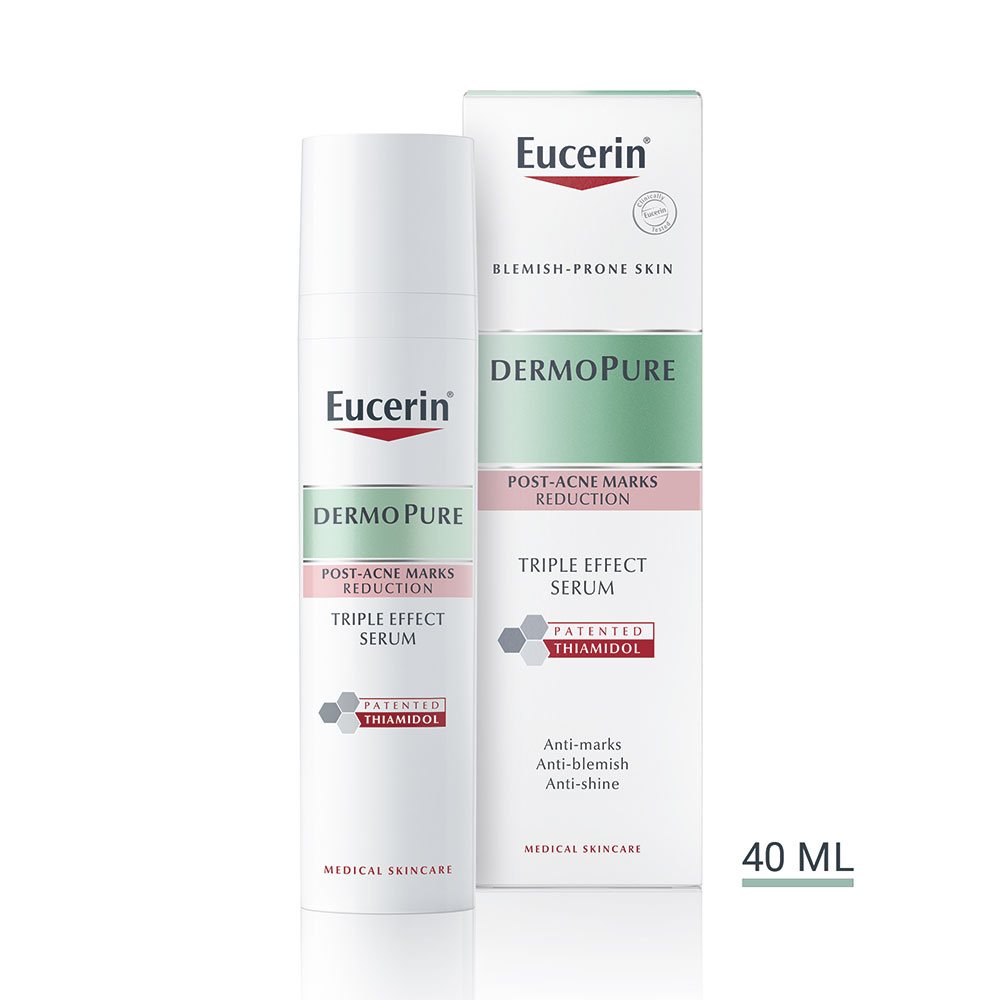 Eucerin DermoPure Serum sa trostrukim efektom koji sadrži patentirani Thiamidol vam omogućava da konačno pobedite simptome masne i problematične kože i tamne fleke od akcni jer deluje: