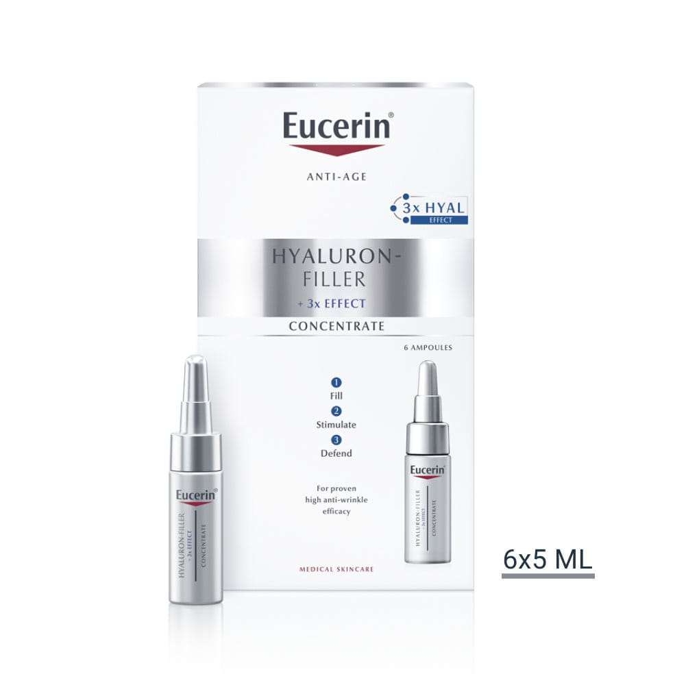 Eucerin Hyaluron-Filler je specijalno formulirana da deluje na prve znake starenja kao što su fine linije i bore. S obzirom na to da se naša koža razlikuje kao i mi sami, ona može drugačije stariti s obzirom na našu genetiku i način života. Ovi znakovi starenja se mogu normalno javiti kod osoba oko 30te godine. Preparati Hyaluron-Filler linije deluju protiv procesa starenja tako što popunjavaju duboke bore. Za vidljivo glatku, blistaviju i podmlađenu kožu.