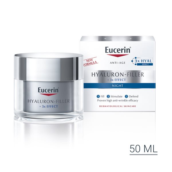 Eucerin Hyaluron-Filler Noćna krema utiče na prve znakove starenja. Ona vidljivo popunjava fine linije i duboke bore za podmlađen izgled a u isto vreme stimuliše regenraciju kože.