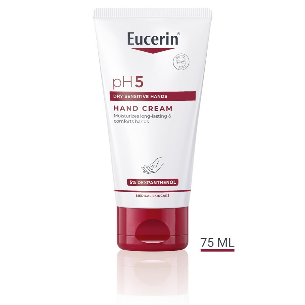 Eucerin pH5 Krema za ruke je posebno formulisana kako bi suve, osetljive ruke učinila otpornijim i sprečila njihovo isušivanje. Eucerinov jedinstveni pH Sistem ravnoteže sadrži pH5 Citratni pufer kako bi se obnovila i održala optimalna pH vrednost kože. Formulacija takođe sadrži dekspantenol, aktivni sastojak poznat po svojim regenerativnim svojstvima. On jača prirodne odbrambene mehanizme kože i smanjuje njenu osetljivost.