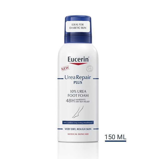 Eucerin UreaRepair PLUS Kreme za stopala sa 10% uree i Eucerin UreaRapair PLUS Pene za stopala sa 10% uree sadrže iste ključne sastojke, ali Eucerin UreaRepair PLUS Pena za stopala sa 10% uree ima neke ključne razlike. Parfimisana je, poseduje teksturu pene i dolazi u obliku spreja, pružajući drugačije iskustvo upotrebe od kreme. Takođe se brzo upija, nije lepljiva i nemasna je.